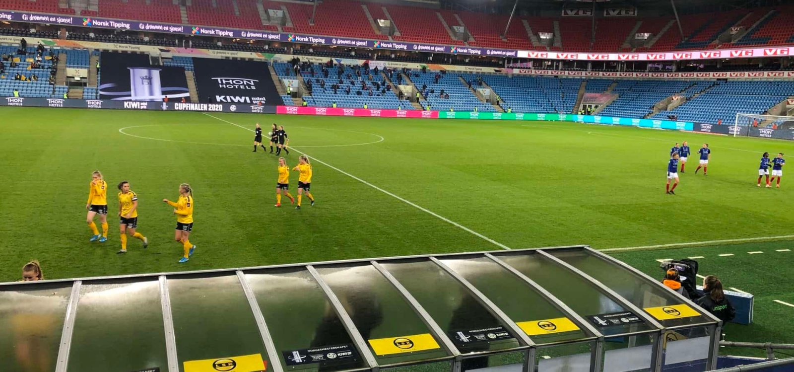 LSK Kvinner startet finalen best. Vi setter et høyt press og får en farlig mulighet allerede etter 4 minutter. Sophie Roman Haug presser keeper og tvinger frem en panikkartet klarering fra VIF-målvakten. Ballen går deretter rett i Soph og spretter ut.